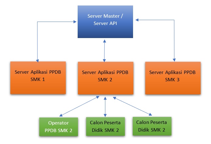Masing-masing aplikasi PPDB di web sekolah, berkomunikasi dengan Server Master / Server API.